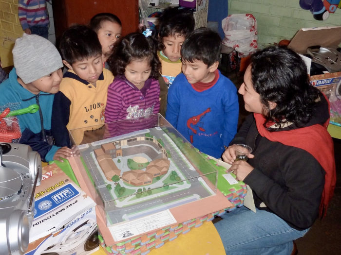 Architektin Rondón erklärt den Kindern die geplanten Bauten